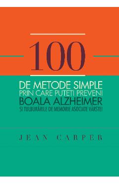 100 de metode simple prin care puteti preveni boala Alzheimer si tulburarile de memorie asociate varstei Cei mai multi dintre noi cred ca sunt foarte putine masuri de preventie sau chiar ca nu este nimic de facut pentru a evita boala Alzheimer. Oamenii de stiinta ne demonstreaza insa ca lucrurile nu mai stau asa. De fapt, cercetatori renumiti din acest domeniu stiu in prezent ca cea mai buna solutie pe care o avem la indemana sau, poate, chiar singura noastra speranta in lupta impotriva bolii Alzheimer este aceea de a preveni instalarea ei. Dupa ce renumita autoare de bestselleruri Jean Carper a descoperit ca este purtatoarea genei care o face susceptibila de a dezvolta boala Alzheimer, s-a hotarat sa gaseasca toate dovezile stiintifice recente in sprijinul evitarii acestei boli, care face ravagii in intreaga lume. Ea a descoperit astfel 100 de modalitati extrem de simple, testate stiintific, prin care putem reduce la minimum posibilitatea de a cadea victime bolii Alzheimer, declinului memoriei si altor forme de dementa. Stiati ca vitamina B12 are un rol important in a impiedica deteriorarea creierului? Ca sucul de mere are aceleasi efecte favorabile ca unul dintre medicamentele folosite in boala Alzheimer? Ca navigarea pe Internet intareste celulele creierului si le impiedica sa imbatraneasca? Sau ca infectiile banale si o substanta folosita pe scara larga pentru anestezia generala pot declansa boala Alzheimer? Ori ca meditatia favorizeaza dezvoltarea de noi neuroni? si ca exercitiile fizice au rol benefic pentru creierul nostru? Este de ajuns sa luati fie si numai cateva masuri preventive, pentru a evita cat mai mult posibil instalarea bolii Alzheimer si a va schimba astfel in bine viitorul. Daca reusiti sa amanati fie si cu cinci ani declansarea bolii, reduceti deja la jumatate posibilitatea instalarii ei. Amanati cu zece ani „intalnirea“ cu boala Alzheimer si veti avea toate sansele sa traiti pana la o varsta inaintata, fara sa fi avut de suferit de pe urma ei. Cartea lui Jean Carper va va schimba atitudinea fata de aceasta boala si va va oferi niste raspunsuri surprinzatoare in privinta sanatatii creierului, ajutandu‑va sa nu va confruntati cu aceasta boala necrutatoare. Jean Carper este de profesie jurnalista, specializata in probleme medicale si de nutritie, si a obtinut numeroase premii pentru activitatea sa. Este autoarea a 23 de carti, unele dintre acestea fiind declarate „bestseller New York Times“. De asemenea, este editor colaborator in cadrul revistei USA Weekend, realizand de 14 ani rubrica „EatSmart“. Jean Carper a fost primul corespondent senior medical al CNN, in cadrul acestei functii obtinand prestigiosul premiu ACE, acordat pentru seria sa de emisiuni despre neoplasmul cerebral. De asemenea, a primit mai multe premii de excelenta in activitatea jurnalistica, din partea American Aging Association si a American College of Nutrition, si face parte si din consiliul de conducere al American Aging Association si al American Botanical Council. Este licentiata a Ohio Wesleyan University, care i-a acordat premiul pentru realizari deosebite in intreaga activitate. Locuieste in Washington, D.C., si in Florida.