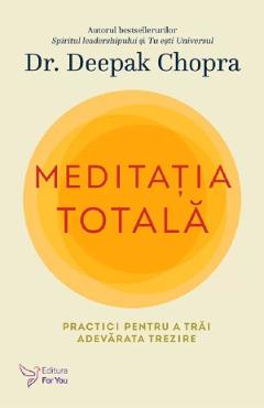 Atinge noi dimensiuni ale vietii fara stres! In ultimii 30 de ani, dr. Deepak Chopra s-a aflat in fruntea "revolutiei meditatiei" in Occident. Cartea sa Meditatia totala ofera o reinterpretare revolutionara a beneficiilor fizice, mentale, emotionale, relationale si spirituale pe care le aduce aceasta practica. Dr. Chopra te indruma sa-ti trezesti nivelurile de constientizare ce iti cultiva o viziune clara, iti vindeca mintea si trupul si te ajuta sa recuperezi ceea ce esti cu adevarat. Citindu-i cartea, parcurgi un proces transformator avand ca rezultat trezirea corpului, mintii si spiritului, ceea ce iti va permite sa traiesti intr-o stare de constientizare deschisa, libera, creatoare si fericita 24 de ore pe zi. Cu aceasta carte, Deepak ridica practica meditatiei la nivelul de la care atingi o constienta superioara si o existenta mai implinita. El iti prezinta noi cercetari privind meditatia si beneficiile acesteia, iti ofera exercitii practice de constientizare si incheie cu un program de meditatii si mantre pentru revolutionarea fiecarui aspect al vietii tale. Te‑ai nascut intr‑o lume in care alinierea cu Unimea nu face parte din pregatirea si educatia unui copil. Aceasta lipsa a generat mereu multa confuzie si indoiala. Daca nu esti constient ca natura e capabila sa te sustina in tot ce gandesti, spui si faci, iti vine mult mai usor sa faci alegeri care iti dezechilibreaza viata in moduri mai mici sau mai mari. Solutia nu e sa aplici mai mult efort in luarea unor decizii mai bune, intrucat exista intotdeauna consecinte neprevazute. Secretul este sa te aliniezi cu Unimea, adica sa practici meditatia totala. Nu trebuie sa sacrifici nimic din ceea ce este bun in viata ta prezenta, caci trezirea extinde orice aspect al vietii infloritoare. Trebuie doar sa iei decizia de a te trezi, aici si acum. Acesta este primul pas in directia unui viitor care functioneaza cu adevarat, in locul unui prezent care ne ameninta cu esecul. - Dr. Deepak Chopra