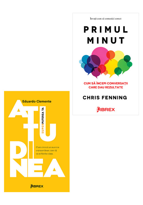 Pachetul contine urmatoarele carti : 1. Atitudinea -  Superputerea ta / Imbunatateste-ti viata si cariera cu o serie de sfaturi valoroase pentru a obtine succesul, a gandi pozitiv si a dezvolta abilitati puternice de adaptare. S-ar putea sa te afli intr-o spirala negativa din punct de vedere psihologic, crezand ca nu esti suficient de bun, ca nu vei reusi niciodata sa avansezi si ca lumea este nedreapta. Sau poate ca te simti destul de bine in legatura cu atitudinea ta, dar stii ca exista intotdeauna loc de imbunatatire si esti curios ce poti schimba. Oricare ar fi pozitia ta actuala, ai posibilitatea de a face o schimbare in viata ta. Iti poti imbunatati in mod activ situatia, deoarece totul se rezuma la atitudine, iar atitudinea ta nu este prestabilita. Chiar mai bine - nu ai nevoie de un milion de cursuri de formare sau de un MBA pentru a o ajusta, ci o poti face pas cu pas.  CE VEI GASI IN ACEASTA CARTE:  Important! Aceasta carte nu este o lista de lucruri de facut! Vei invata ca atitudinea se refera la modul in care te percep ceilalti, dar si modul in care te percepi pe tine insuti, diferenta dintre atitudinea ta si personalitatea ta si cum sa-ti imbunatatesti complet viata si cariera prin intelegerea si gestionarea mai buna a:  - Increderii - Gandirii pozitive - Mentalitatii de crestere - Inteligentei emotionale - Adaptabilitatii - Rezilientei - Mentalitatii de rezolvare a problemelor  Ca un bonus, cartea include si un set de sfaturi despre cum sa iti valorifici cel mai bine abilitatile precum gestionarea asteptarilor si dorinta de a excela pentru a obtine un succes puternic in cariera. Depinde de tine sa ai o parere buna despre tine, sa lucrezi la autoperfectionarea si motivatia ta, astfel incat sa iti potentezi succesul si fericirea in viata.  2. Primul minut / INCEPI CONVERSATIILE IN MOD CORECT? Comunicarea trebuie sa fie clara, concisa si sa ajunga rapid la subiect. Problema este ca nu stim intotdeauna cum sa facem acest lucru. Ce inseamna sa fii concis? Cum poate fi rezumat un subiect complex in doar cateva randuri?  Aceasta carte este un ghid ce te indruma pas cu pas spre o comunicare clara si concisa in conversatiile de zi cu zi de la locul de munca. A fi concis nu inseamna sa incerci sa condensezi toate informatiile in saizeci de secunde. Este vorba despre a avea o intentie clara, de a vorbi despre un singur subiect la un moment dat si de a te concentra asupra solutiilor in loc sa insisti asupra problemelor. De-a lungul acestei carti vei descoperi cum sa:  - Ai conversatii si intalniri de lucru mai scurte si mai bune - Ajungi mai repede la subiect fara sa divaghezi sau sa te indepartezi de el - Iti conduci receptorul spre solutia de care ai nevoie - Aplici o tehnica la aproape fiecare discutie, e-mail, prezentare si interviu cu rezultate excelente Aceasta carte este rezultatul a peste 20.000 de conversatii, atat in afaceri, cat si la locuri de munca tehnice. Chris Fenning a instruit persoane si echipe din intreaga lume in aceste tehnici. El a lucrat cu organizatii, de la start-up-uri la companii din Fortune 50 si FTSE 100. Aceste metode functioneaza pentru toata lumea.