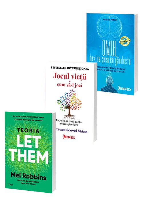 Pachetul contine urmatoarele carti : Teoria Let Them Autoarea bestsellerului Regula de 5 secunde Doua cuvinte vor schimba modul in care gandesti despre viata ta in intregime. In aceasta carte vei invata cum doua cuvinte simple – Let Them (Lasa-i) – te pot descatusa. Te vei simti eliberat de opiniile, dramele si judecatile celorlalti, eliberat din ciclul epuizant al incercarilor de a gestiona totul si de dirija pe toata lumea din jurul tau. Exista un mod mai bun de a-ti trai viata. Teoria Let Them este o metoda demonstrata, care te invata cum sa iti protejezi timpul si energia si sa te concentrezi asupra lucrurilor care conteaza cu adevarat pentru tine. Ai petrecut prea multa vreme cautand aprobarea altora, gestionandu-le fericirea si permitand ca opiniile lor sa te tina pe loc. Invata cum sa incetezi sa le oferi puterea ta celorlalti si incepe sa iti creezi o viata in care tu sa fii pe primul loc: visurile tale, scopurile tale, fericirea ta. Let Them este un instrument revolutionar despre care milioane de oameni din intreaga lume nu inceteaza sa vorbeasca, pentru ca functioneaza cu adevarat. Cea mai rapida cale de a prelua controlul asupra vietii tale este sa nu mai incerci sa-i controlezi pe altii si sa te concentrezi asupra a ceea ce poti controla: tu insuti. Lasa-i pe ceilalti sa isi traiasca viata si vei ajunge in sfarsit sa ti-o traiesti pe a ta. Mel Robbins este autoarea unor carti aflate in topul bestsellerelor New York Times si experta de renume mondial in lucru cu atitudinea mentala (mindset), in motivatie si schimbare comportamentala, iar lucrarile ei au fost traduse in 41 de limbi. Impactul lui Mel este cu adevarat global: milioane de volume vandute, sapte titluri #1 Audible si miliarde de vizualizari. Ca gazda a The Mel Robbins Podcast, unul dintre cele mai bine clasate podcasturi din lume, Mel le insufla in fiecare zi incredere ascultatorilor sai din 194 de tari. Compania ei media, 143 Studios Inc., produce continut premium, provocator, evenimente transformatoare si programe originale de training pentru clienti cum sunt Starbucks, JPMorgan-Chase, LinkedIn, Headspace si Ultra Beauty. Cunoscuta pentru capacitatea ei de a simplifica subiecte complicate pana la nivelul unor actiuni practice de zi cu zi, Mel Robbins ofera in Teoria Let Them cea mai puternica si mai profunda carte a sa de pana acum. Jocul vie ții și cum să-l joci - cea mai cunoscuta carte despre succes din lume! Majoritatea oamenilor consideră viața o luptă, dar nu este o luptă, ci un joc. Este un joc ce însă nu poate fi jucat fără cunoașterea legilor spirituale. Florence Scovel Shinn este unul dintre cei mai populari profesori de predare a modalit ăților de succes. Cărțile ei, populare în toată lumea, au schimbat viețile a milioane de oameni. Jocul vie ții și cum să-l joci ne arată că ne putem bucura de lungi perioade de sănătate, prosperitate și fericire. Autoarea ne împărtășește povești adevărate din viața reală pentru a ilustra modul în care atitudinea și afirmațiile pozitive reușesc invariabil să transforme orice persoană într-un învingător, capabil să controleze circumstanțele și să elibereze abundența prin cunoașterea legilor spirituale. „Ca să jucăm cu succes jocul vieții trebuie să ne antrenăm imaginația. O persoană cu o imaginație antrenată pentru a vizualiza numai lucruri bune aduce în viața ei «orice dorință dreaptă a inimii sale», sănătate, bogăție, iubire, prieteni, perfecta exprimare a sinelui, cele mai nobile idealuri.“ Omul devine ceea ce gandeste , un bestseller clasic, James Allen dezvaluie modul in care gandurile noastre ne modeleaza realitatea. De la caracter la circumstantele de viata, de la sanatate la aspectul fizic, autorul ne ajuta sa detinem controlul asupra gandurilor noastre pentru a ne crea viata pe care ne-o dorim si pentru a ne elibera de esecuri si frustrari. Plina de sfaturi practice pentru persoanele care doresc sa devina cea mai buna versiune a lor, cartea a inspirat milioane de oameni si continua sa arate adevarata cale spre o viata fericita si plina de succes. „Mintea OMULUI poate fi comparata cu o gradina, care poate fi cultivata in mod inteligent sau lasata sa se dezlantuie; dar, fie ca este cultivata sau neglijata, ea trebuie sa dea si va da roade. Daca nu se planteaza in ea nicio samanta utila, atunci o multime de buruieni inutile vor aparea in ea si vor continua sa se inmulteasca.” – James Allen