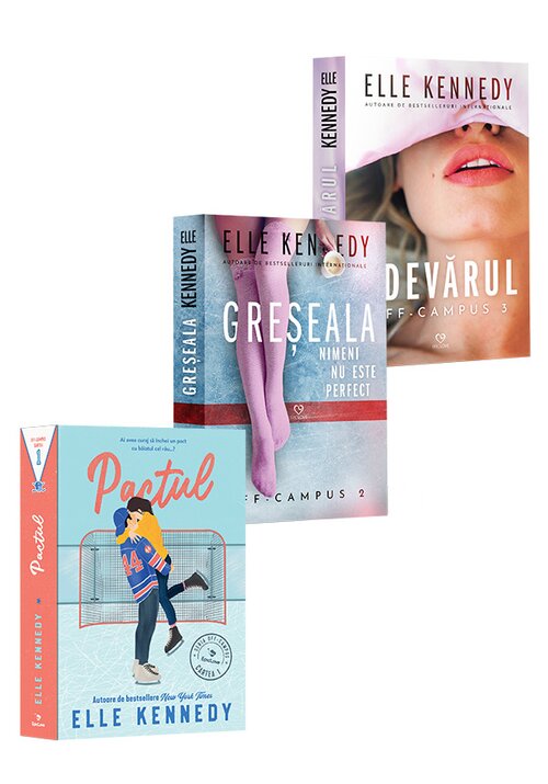 OFF-CAMPUS este o serie bestseller international, vanduta in milioane de exemplare si tradusa in peste douazeci de limbi. Seria Off-Campus este scrisa de Elle Kennedy a aparut la editura Epica si contine titlurile: 1. Pactul 2. Greseala. Seria Off-Campus Vol. 2 3. Adevarul. Seria Off-Campus Vol. 3 Autoare de bestselleruri New York Times, USA Today și Wall Street Journal, Elle Kennedy a crescut în suburbiile orașului Toronto, Ontario, fiind licențiată în engleză la Universitatea York. A publicat până în prezent peste patruzeci de romane, multe dintre ele figurând pe listele de bestselleruri din diferite țări. Iubește personajele feminine puternice, eroii alfa sexy, adoră să creioneze scene romantice, presărate și cu pericole, ca să păstreze lucrurile interesante. Descrierea cartii Pactul Ea e pe cale sa incheie un pact cu baiatul cel rau… In sfarsit, Hannah Wells a gasit pe cineva de care se simte atrasa. Desi de obicei e sigura pe sine, la capitolul sex si seductie are multe probleme, provocate de un incident dureros din trecutul ei. Daca vrea cu adevarat sa atraga atentia tanarului pe care il place, Hannah va trebui sa isi invinga nesiguranta si sa il faca sa o observe... chiar daca asta inseamna sa il mediteze pe capitanul echipei de hochei a universitatii - un tip enervant si increzut -, in schimbul unei intalniri aranjate. ... si va fi o experienta ametitoare. Cea mai arzatoare dorinta a lui Garrett Graham este sa joace hochei in liga profesionistilor, dupa ce termina facultatea. Dar o nota catastrofala obtinuta la un examen ameninta sa zadarniceasca visul pentru care a muncit atat de mult. Prin urmare, daca pentru a-si asigura locul in echipa trebuie sa ajute o fata sa starneasca gelozia altuia, nimic nu ii va sta in cale. Insa un sarut neasteptat duce la cea mai nebuneasca partida de sex din viata lor. Acum trebuie sa o convinga pe Hannah ca pe el il doreste. Descrierea cartii Greseala. Seria Off-Campus Vol. 2 JOHN LOGAN este un student chipes din anul trei, care poate avea orice fata doreste. Pentru el, un adevarat star in echipa de hochei a universitatii, viata e un sir neintrerupt de petreceri si de aventuri de-o noapte. Cu toate acestea, dincolo de zambetul lui cuceritor si al farmecului personal se ascunde ingrijorarea fata de viitorul care il asteapta dupa absolvire. O intalnire intamplatoare cu GRACE IVERS, o frumoasa studenta de anul intai, il insufleteste si ii distrage atentia de la temerile sale. Dar apoi tanarul face o greseala care o indeparteaza pe Grace, asa ca John are de gand sa ii arate ca merita sa primeasca inca o sansa. Dupa un prim an de facultate nu tocmai reusit, Grace se intoarce la Universitatea Briar ceva mai inteleapta, crezand ca a trecut peste incidentul neplacut cu acel jucator de hochei arogant. Nu mai e fata sfioasa pe care el a cunoscut-o. Grace e hotarata: daca John o vrea inapoi, va trebui sa faca mari eforturi. De data asta, ea va conduce jocul… si planuieste sa-l tina pe jar. Descrierea cartii Adevarul. Seria Off-Campus Vol. 3: ALLIE HAYES traieste o criza existentiala. Momentul absolvirii se apropie, si totusi ea inca nu s-a hotarat ce va face dupa facultate. Chiar mai rau, sufera dupa ce a pus capat unei relatii indelungate cu iubitul ei. Cu siguranta, sexul de consolare nu este o solutie, insa chipesul hocheist Dean Di Laurentis este irezistibil. Prin urmare, ce o costa sa se cupleze cu unul dintre starurile echipei de hochei a universitatii? Dar — isi promite Allie — o s-o faca o singura data, pentru ca viitorul ei este incert si nu are de gand sa-si complice mai mult viata incurcandu-se cu regele aventurilor de o noapte. DEAN DI LAURENTIS are parte de orice isi doreste: fete, faima si popularitate. Inainte de Allie, nicio fata nu l-a mai trimis la plimbare dupa prima noapte petrecuta impreuna. Dean e uluit. Inca nu se simte pregatit sa renunte la frumoasa blonda. In timp ce se straduieste sa o cucereasca in adevaratul sens al cuvantului, apar situatii neprevazute care il fac sa se intrebe daca nu cumva a venit timpul sa i se dedice unei singure fete… si iubirii.