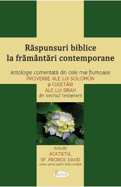 Raspunsuri biblice la framantari contemporane - Antologie comentata din cele mai frumoase proverbe ale lui Solomon si cugetari ale lui Sirah din Vechiul Testament. Include acatistul Sf. Prooroc David pentru prima oara in limba romana Daca ne-am intoarce la gandirea stramosilor nostri si am restabili intelepciunii rolul central pe care ar trebui sa il detina in vietile noastre, roadele s-ar vadi curand. Ne putem potoli setea din izvorul intelepciunii proverbelor, caci acestea „exprima valorile si perceptiile fundamentale care caracterizeaza o comunitate de-a lungul a multor generatii. Ele sunt o cheie a identitatii stabile a comunitatii, si exact aceasta le face sa fie valoroase in vremuri de tranzitie si de criza. (ED, p. 13) Vechii israeliti recunosteau in proverbe „o intelepciune pe care timpul a testat-o si care poate oferi un punct de orientare celor tulburati de schimbari si de complexitatea noilor experiente. Deoarece ofera o perspectiva pe termen lung, proverbele ofera o cale de iesire din labirintul prezentului. Omul care cunoaste proverbele se afla deasupra labirintului, iar de acolo poate vedea cum este alcatuit si poate vedea o solutie la impasul actual. Un exemplu al modului in care un proverb poate intari in vreme de tulburari sau incertitudini de orice fel il gasim in cartile Regilor din Biblie. Cand prorocul Samuel a fost trimis de Dumnezeu sa unga rege peste Israel pe unul dintre fiii lui Iesei, privirea lui este atrasa mai intai de fiul cel mai mare, Eliab, inalt si chipes. Dumnezeu insa corecteaza alegerea lui Samuel si urmeaza, in text, un proverb: "Dumnezeu nu vede asa cum vede omul: omul se uita la fata, dar Dumnezeu se uita in inima" (I Regi 16, 7).