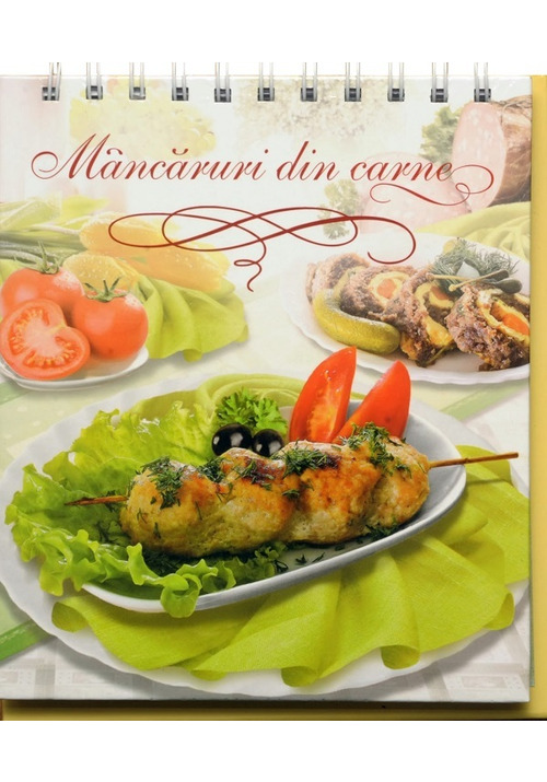 Prin traditia formata din vremuri indepartate, mancarurile din carne sunt practic nelipsite in lista bucatelor pe care le consumam la mesele de zi cu zi sau de sarbatoare. Ele au un rol esential in alimentatia noastra.Carnea este unul dinte cele mai importante produse alimentare, in primul rand datorita proteinelor pe care le contine si care sunt asimilate de organismul uman. Acest retetar contine 120 de retete din carne, de la aperitive, salate, supe si ciorbe, la mancaruri la cuptor. Are un format foarte atragator, este in stilul calendarelor cu suport, la fiecare reteta avem aranjamentul in farfurie, ingredientele pe gramaj, care se gasesc cu usurinta in toate pietele si hypermarketurile.